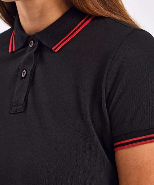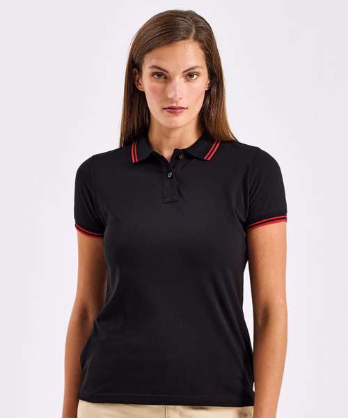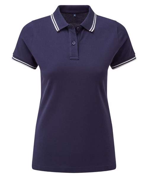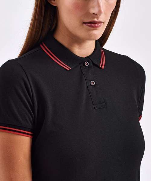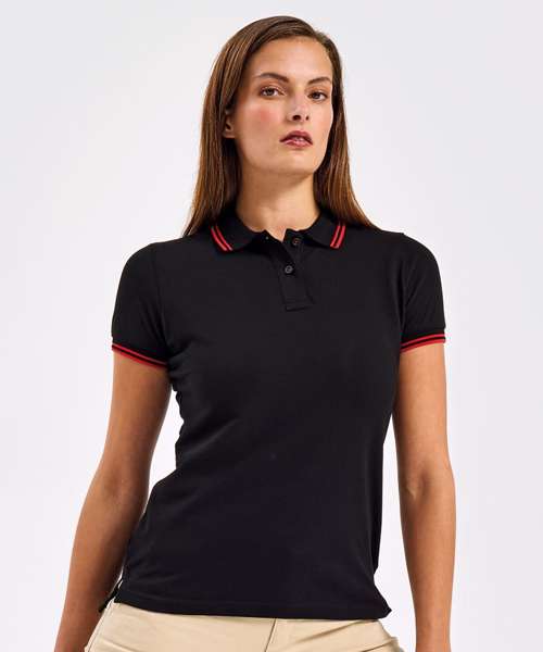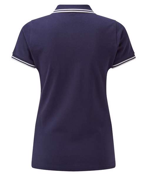 Fitted polo for women with tipped contrast detail to the collar and cuffs. Two contrast coloured buttons on placket. Contrast colour on side vents. Twin-needle stitching on hem. Ribbed knit collar and sleeve cuffs. Machine washable. Product contains no branded neck label. Removable Kimble or looped garment tags. Inner seam label holds important product information on one label with a second label containing brand information which can be cut-away. Please note old stock may contain a fixed branded label.
