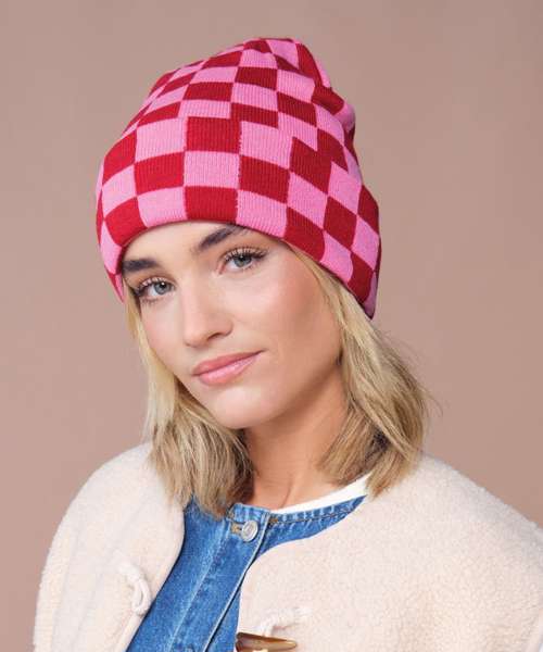 Checkerboard print design. Fine ribbed knit. Double-layer knit. Darted crown. Wide cuffed design for optimal decoration. TearAway label for easy rebranding.