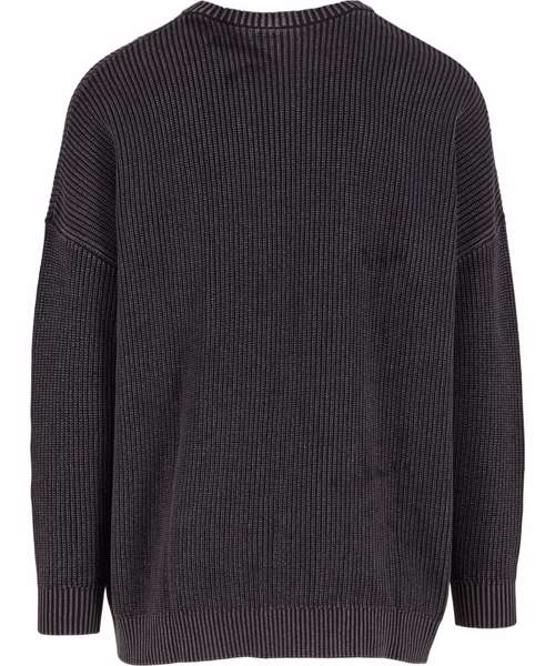 Oversized fit. Heavily dropped shoulders. Patent knit. Knit cuffs and hem. Acid wash.