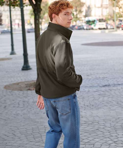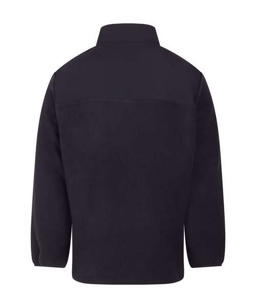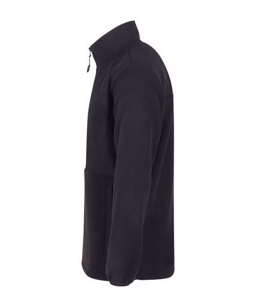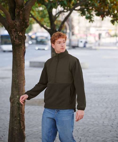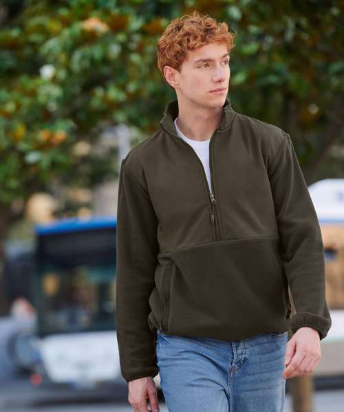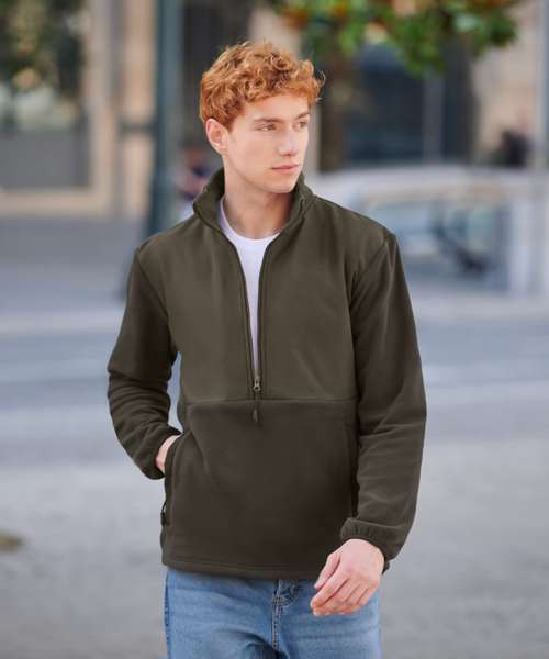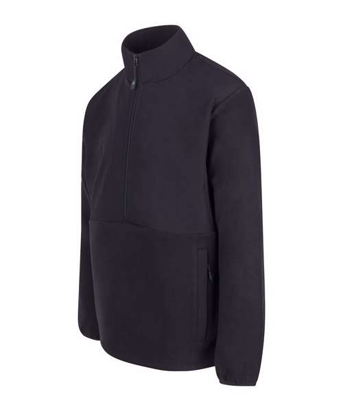 1/2-zip styling. Microfleece fabric with ripstop fabric overlay on upper torso front, back and collar. Centre front zip with bottom zip garage. Two side welt pockets with an inner kangaroo pocket. Stretch binding on the cuff opening. Adjustable hem with elastic and toggles. Tag-free for easy rebranding. Made from 100% recycled polyester.
