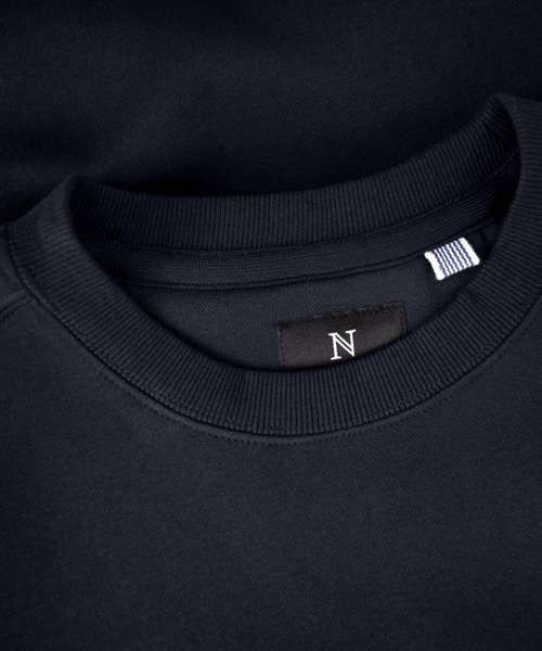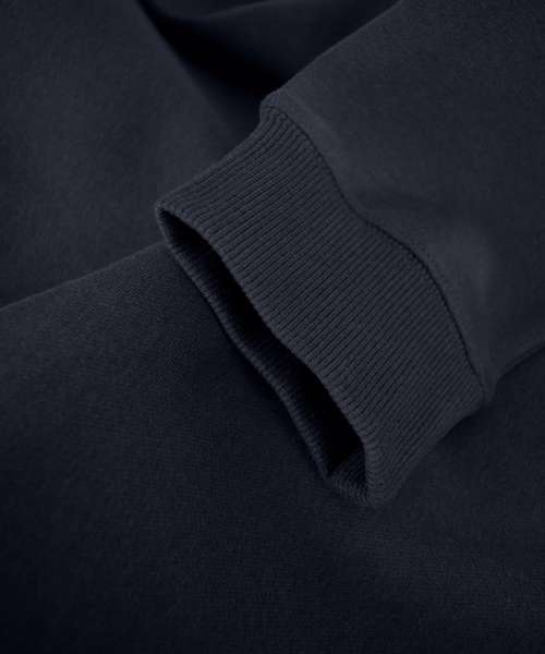 DETAILS: Combed long-staple organic cotton. Brushed fleece lining with short-shave treatment. Forwarded shoulder seems. Ribbed collar, hem and sleeves. Organic cotton. Recycled polyester.