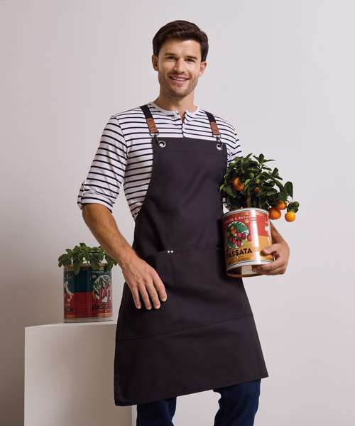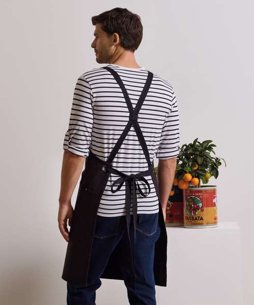 Cross-back apron with self-coloured woven herringbone straps. Fabric piece to hold cross-back shape in place. Faux leather detail to the straps. Gun metal/antique brass eyelets. Carabiner clips. Three large patch pockets stitched into a slight curve. Pen pocket. Rivet details. Self-fabric cloth holder. Cotton-rich with certified recycled polyester for durability. Length: 86cm; width: 72cm.