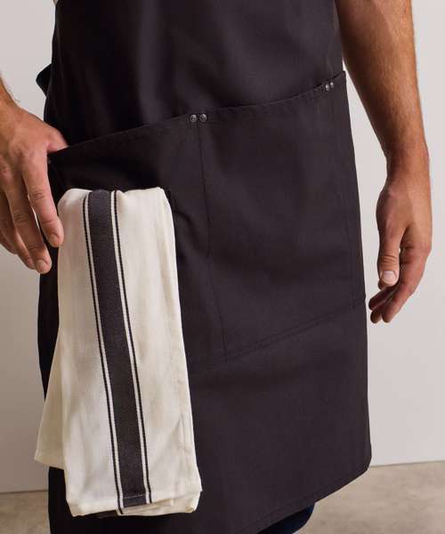 A beautifully styled apron with exquisite design features. Cross-back in its design, the apron straps are constructed in a self-coloured herringbone weave and attached to the apron through eyelets with clasps. The straps cross at the back, loop through eyelets at the waist and tie neatly at the back. The apron body has three large patch pockets with rivet details and a self-fabric cloth holder. There’s also a smaller pen pocket. A cotton/ and certified recycled polyester canvas blend gives this Clip ‘n’ Clasp apron durability, shape and a soft hand feel.