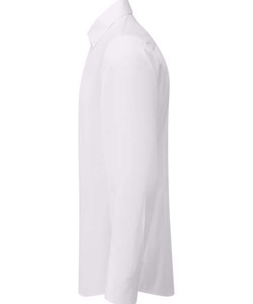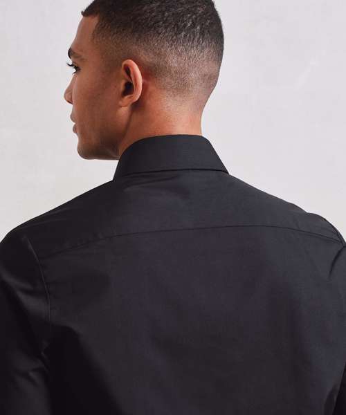 Men’s poplin shirt made with certified recycled polyester and cotton. Stiffened formal collar with top button. Full button-through with pearlised buttons on white and self-coloured on black. Two-button adjustable cuff with cufflink hole. Sleeve guard with single button. Curved hemline. Back darts and yoke for overall fit and shape. Easycare fabric.