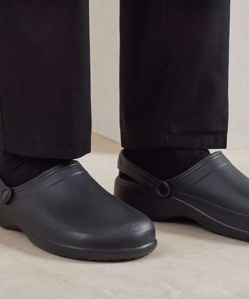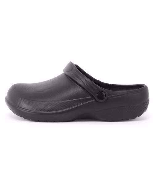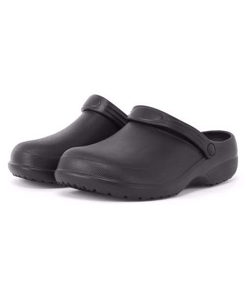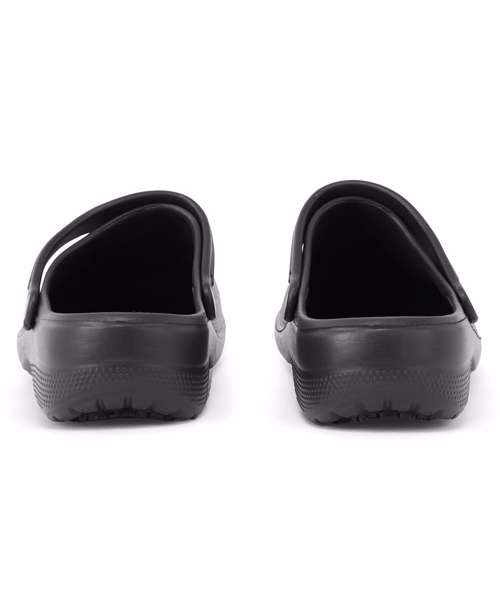 Chef’s clogs with a non-slip outer sole for extra grip on tiled floors. Inner sole with raised bumps for slip resistance and comfort. Slip-on style with moulded heel. Optional hinged strap to secure around the heel. Lightweight rubber, waterproof by nature. Available in five dual sizes. Wide fit.