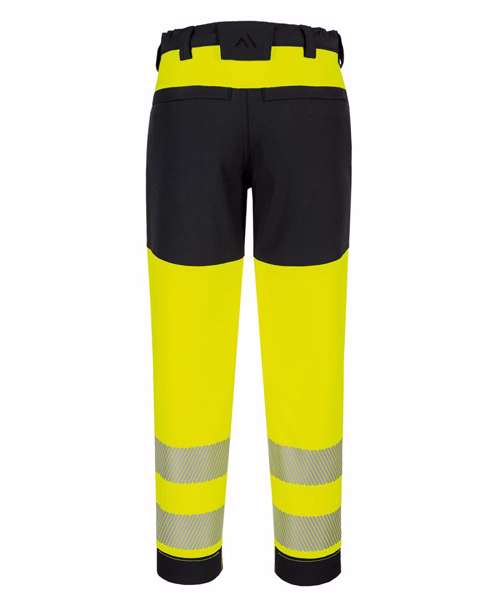 Texpel™ Stain Eco premium stain-resistant finish repels grime and water. Four-way stretch fabric offers ease of movement and added comfort. Stretch crotch gusset provides maximum flexibility and reduces stress. Double-layer reinforced knee protection for extra strength and durability. Adjustable hem – regular to long leg. Side pockets. Handy zipped side thigh pockets. Two back pockets with flap and stud closure. Key loop in pocket. Contrast panels for protection against dirt. Side elastic waist for ultimate wearer comfort. Heat-applied, segmented reflective tape for added visibility. Six pockets for ample storage. Certified to EN ISO 20471 after 25 washes. CE certified.