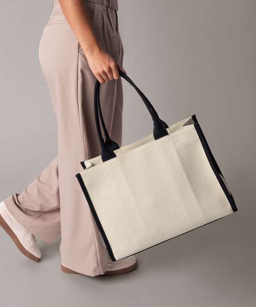 Zipped internal valuables pocket. Premium twill fabric. Structured design. Hidden lining zip for easy decoration access. Internal baseboard. Soft-touch lining. Self-fabric edge trim. High-shine gold metal trims. Self-fabric carry handles. Can be carried by hand or over the shoulder. TearAway label for ease of rebranding. Contains recycled polyester.