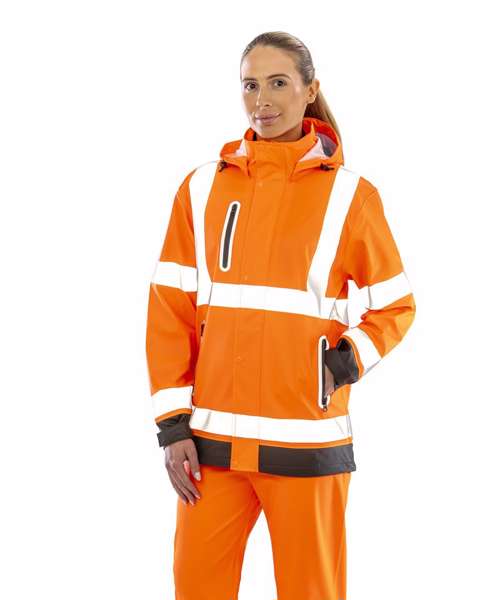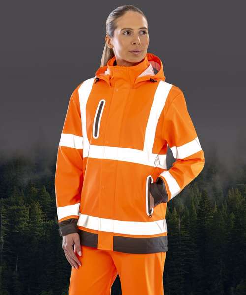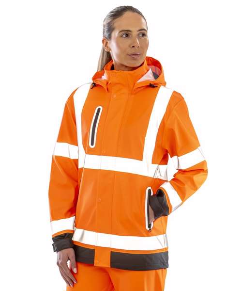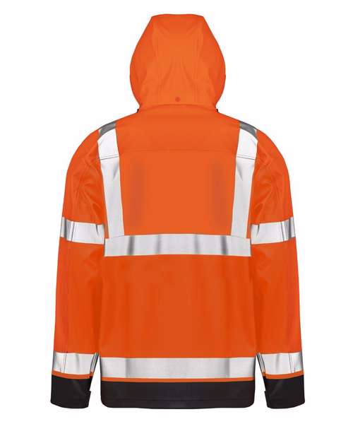 Heavy duty zip-through collar with chin guard and zip pull. White colour recycled backing. Soft and supple feel havier weight fabric. Printed reflective safety bands. Stud closing outer stormflap. Removable drawcord hood. Adjustable tear release cuff. Waterproof welded seams. Zipped pockets with reflective trim. Drawcord hem. Longer length. Hang loop. EN ISO 20471: 2013+A1:2016 Class 3; RIS-3279-TOM:ISSUE 2:2019 Class 3; EN343 3:1 waterproof 5000mm, breathable 1000mvp and windproof. Matches R508X trouser.