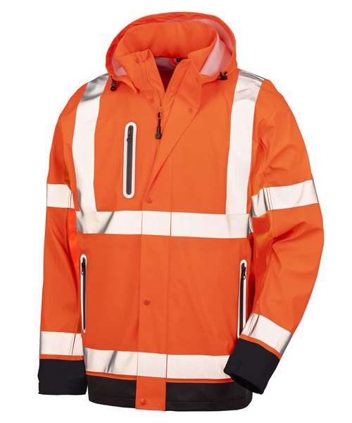 Scandinavian-styled hooded safety jacket in heavier-weight deluxe waterproof fabric with reflective printed safety bands.