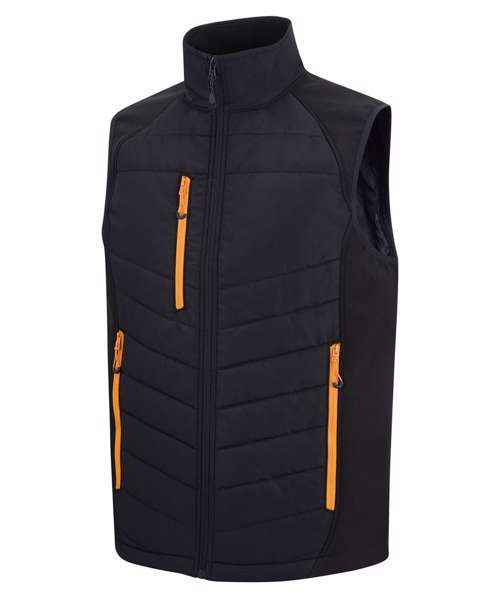 Water-repellent polyester micro poplin. Mechanical stretch softshell on side panels for improved fit and freedom of movement. One zipped chest pocket and two lower zipped pockets. Stretch binding to armholes and hem. Concealed zip entrance in lining for embroidery access. Contains recycled polyester.