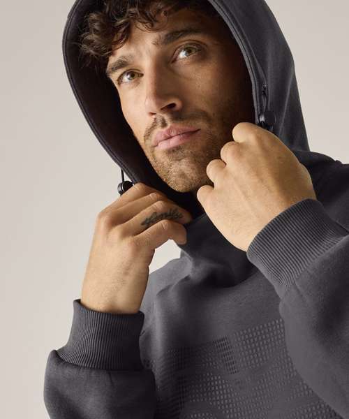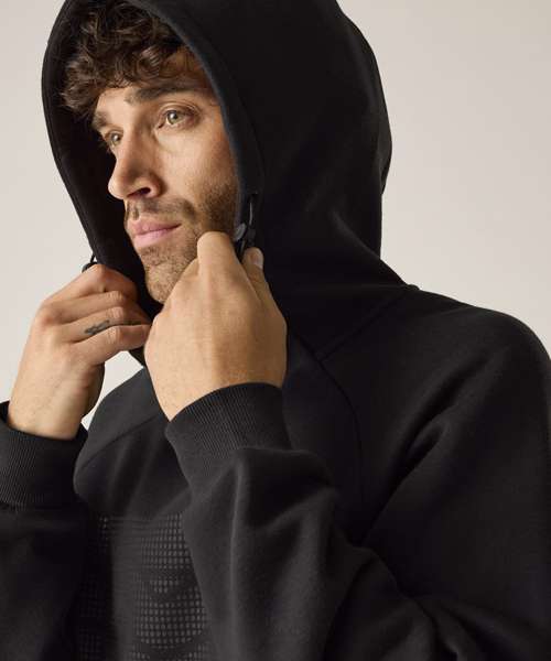 65% Polyester, 35% cotton, brushed back, soft-touch fabric. Graphic print detail. Ribbed cuffs and hem. Grown-on hood with adjusters. Kangaroo pocket to the front.