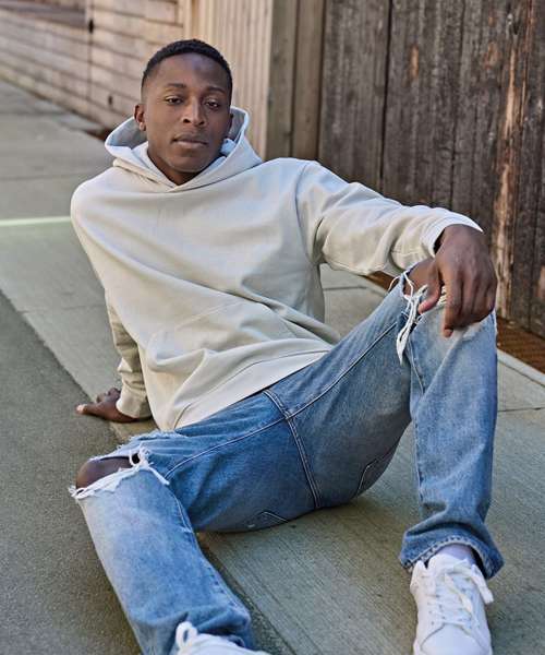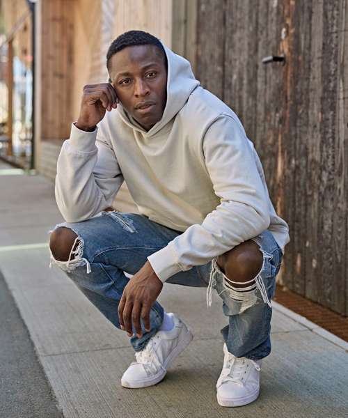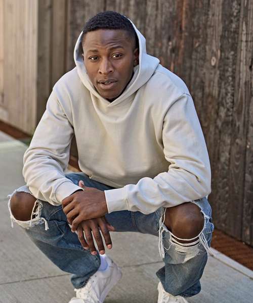 Loose fit. Brushed inside. Half-moon for personalised branding. Ribs with elastane. Double dyed. Double pre-shrunk. Three-thread fabric. Certified organic cotton.