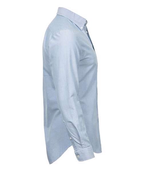 Shaped fit. Button-down collar. Fused collar and cuffs. Back yoke with box pleat. Inside hanger loop. Curved hem. Stretch fabric. Ascolite button wrapping.