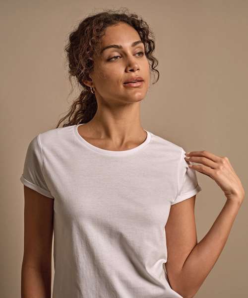 The fashion-fit, single Jersey, Women’s roll-up tee is made from premium quality, long-fibre cotton. It features roll-up sleeves with bar tacks and a large neck opening with a minimalistic neck rib.
