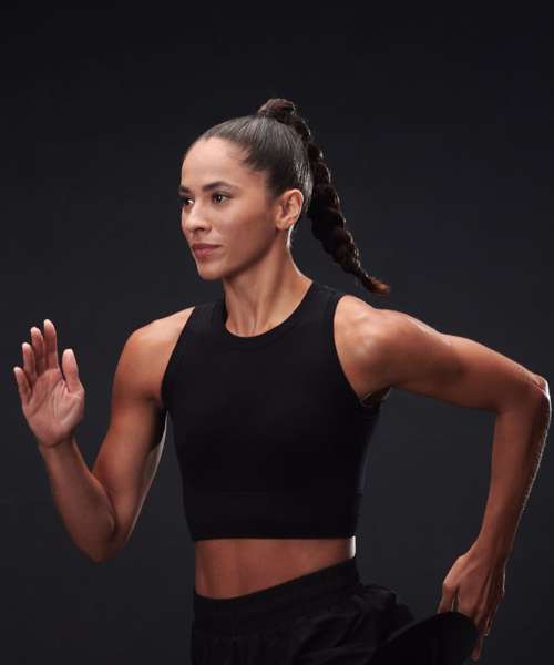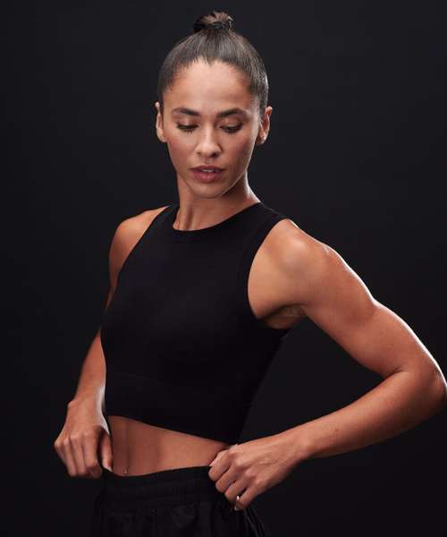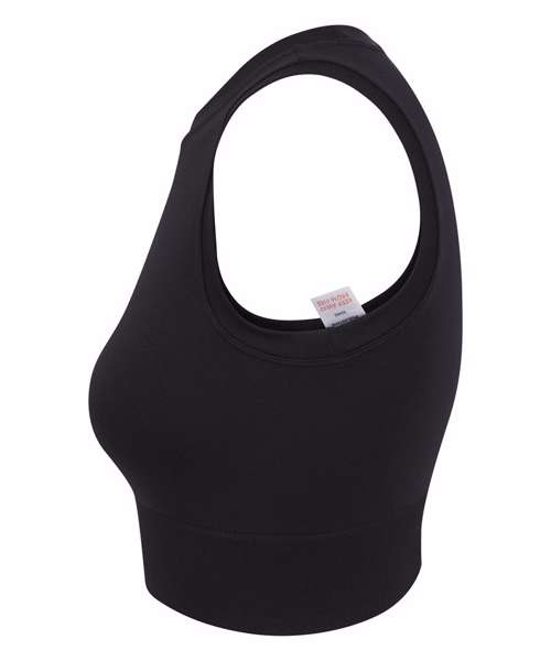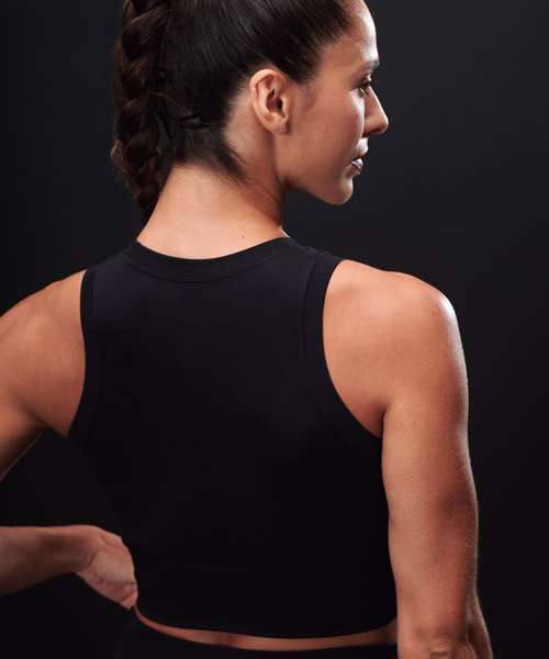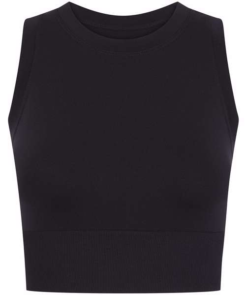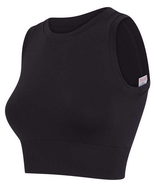 Women’s cropped tank. Seamless fabric. Single-layer front. Self-fabric binding around neck and armhole. Ribbed hem.