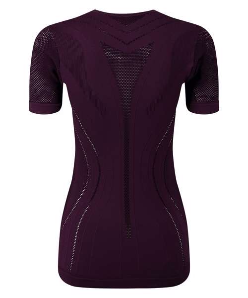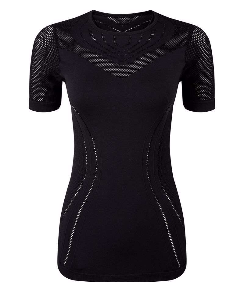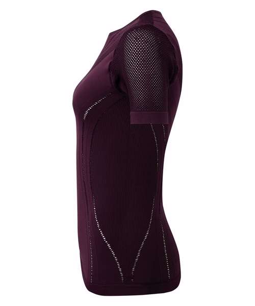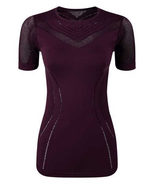 Seamless sports top. Contrast detailing. Short sleeve. Ribbed cuffs and hem. Breathable eyelet detailing that contours to body for a hourglass silhouette. Crew neck. We recommend using block out vinyl and inks.Product contains no branded neck or waist label. Removable Kimble or looped garment tags. Inner seam label holds important product information on one label with a second label containing brand information which can be cut-away.