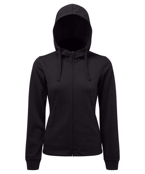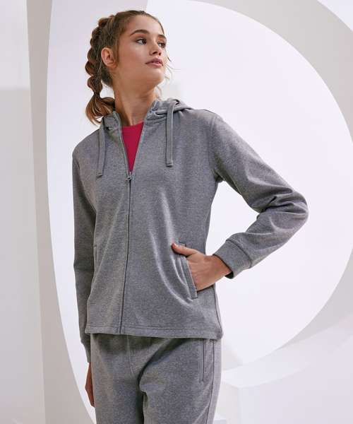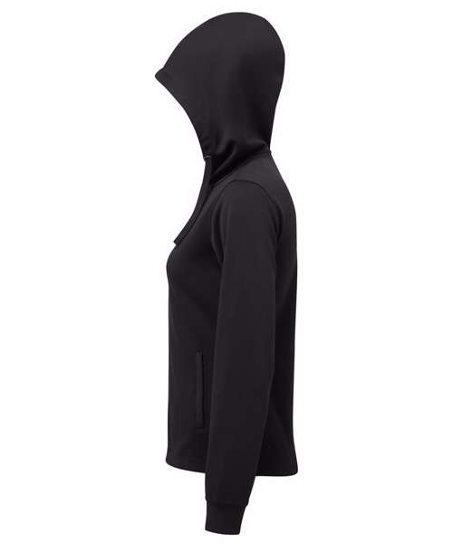 Hooded jacket with chin guard. Full zip-through. Concealed centre zip and zip pockets. Drawstring cord fastenings to hood with chrome eyelets. Double-panelled hood. Feminine fit. Cuffed sleeves. Made with recycled polyester, Spun dyed technology. Spun dye melts colour pigments and recycled polyester together, creating coloured fibres using fewer chemicals, less water and less CO2. Spun dye fabric also improves the colour-fastness of garments. We recommend using block out vinyl and inks.Product contains no branded neck or waist label. Removable Kimble or looped garment tags. Inner seam label holds important product information on one label with a second label containing brand information which can be cut-away.
