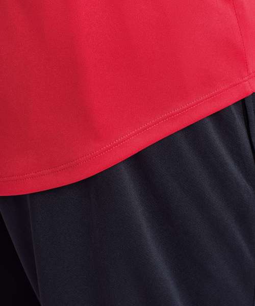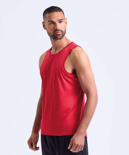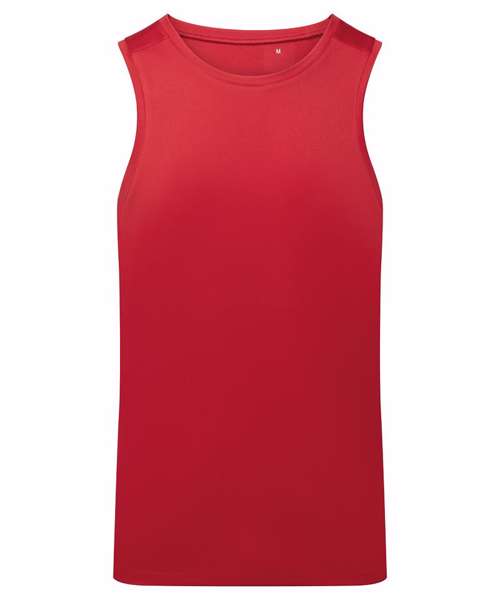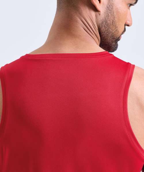 Performance vest. Cationic-dyed. Certified recycled polyester. Wicking fabric. Stretch. Lightweight. Dropped hem. Forward shoulder detail. Crew neck. Smooth finish.