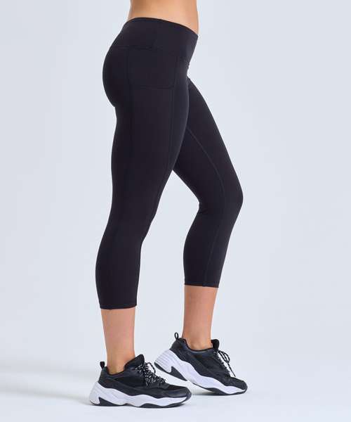 3/4-length leggings. Soft-stretch fabric. Elasticated waistband. Black inner waistband and coin pocket. Side panels to legs with hidden insert pocket. Recycled Polyester. We recommend using block out vinyl and inks.Product contains no branded neck or waist label. Removable Kimble or looped garment tags. Inner seam label holds important product information on one label with a second label containing brand information which can be cut-away.
