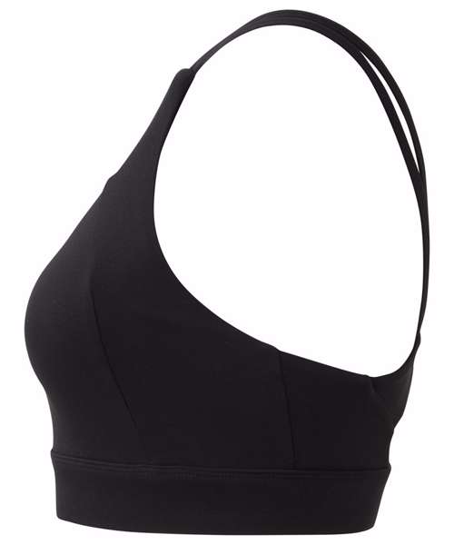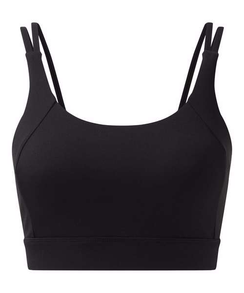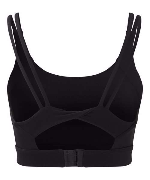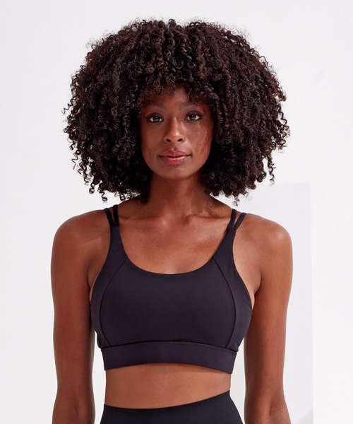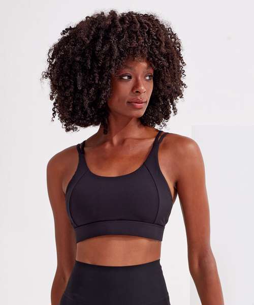 Medium-impact sports bra. Elasticated under bust for added support. Panel detailing to front and back of bra. Removable padding inner. Double strap detailing to both sides of bra. Twist-back detailing that sits above a hook and eye fastening. We recommend using block out vinyl and inks.Product contains no branded neck or waist label. Removable Kimble or looped garment tags. Inner seam label holds important product information on one label with a second label containing brand information which can be cut-away.