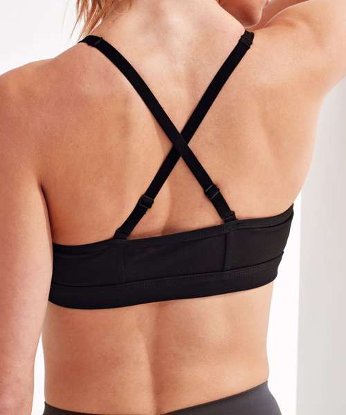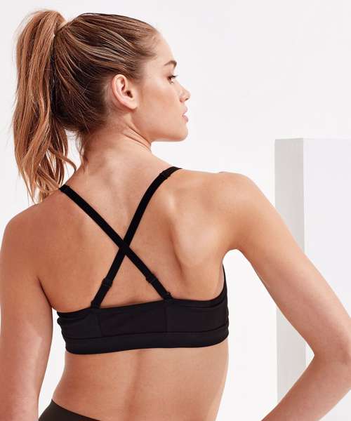 Medium-impact sports bra. Elasticated under bust for added support. Ruched detailing to centre front. Cross back straps with adjusters. Removable padding inner. Panel detailing to back with mesh detail centre. We recommend using block out vinyl and inks.Product contains no branded neck or waist label. Removable Kimble or looped garment tags. Inner seam label holds important product information on one label with a second label containing brand information which can be cut-away.