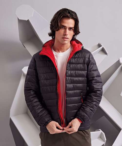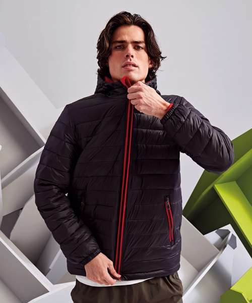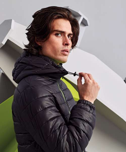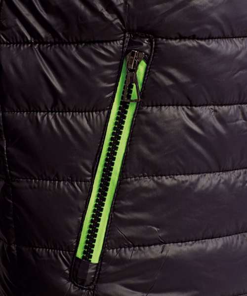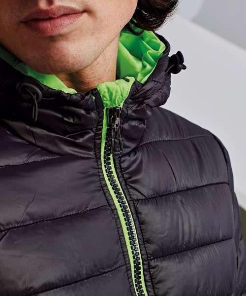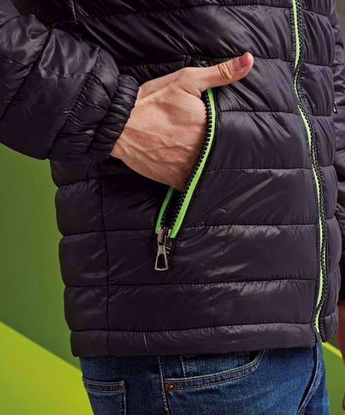 Contrast coil zip on centre front with signature zip puller and internal storm flap and chin guard. Quilted horizontal stitched narrow baffles. Fully-lined in contrast polyester. Coil zip on centre front in contrast colour with internal storm flap and chin guard. Signature zip pullers in black silver finish. Self elasticated cuffs. Contrast coil zip pockets with zip garages. Internal secure zipped double jetted chest pocket. Internal lower body secure pocket. Adjustable shockcord channel at hood opening. 228gsm lightweight polyester fill. Internal back neck hanger loop. Internal zipped opening for embroidery access. Smartphone friendly - internal shockcord loop for headphone wire attachment. Product contains no branded neck label.* Removable Kimble or looped garment tags. Inner seam label holds important product information on one label with a second label containing brand information which can be cut-away.