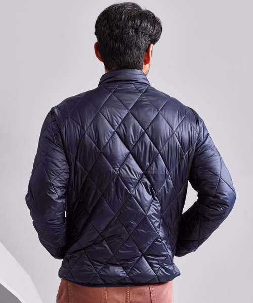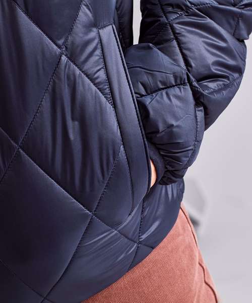 Tonal coil zip on centre front with signature zip puller with mousetail piping on CF zip and internal storm flap with chin guard. Diamond stitched sandwiched baffles. 245gsm polyester fill. Stretch elastic around cuffs and hem for added protection. Binding around internal seams. Smartphone friendly - internal self loop attachment for headphone wire. Cire finish semi shine face fabric. Product contains no branded neck label.* Removable Kimble or looped garment tags. Inner seam label holds important product information on one label with a second label containing brand information which can be cut-away.
