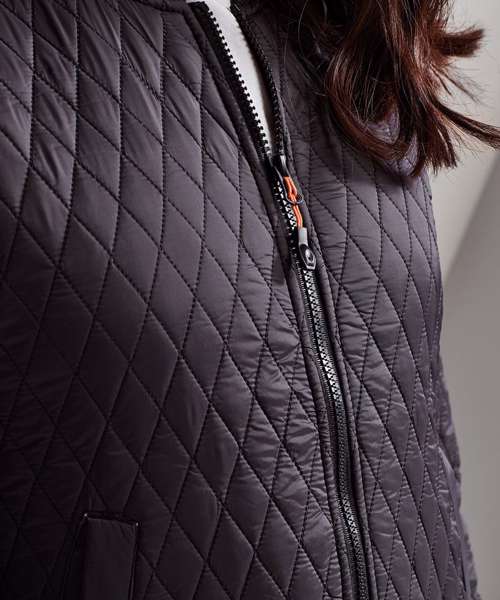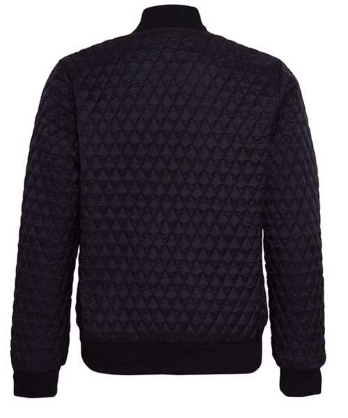 Slim fit jacket. Diamond shaped quilting. Bomber style jacket. Elasticated ribbed knit collar, cuffs and hem. Finishes just beneath the waistline. Full zip through bungee cord style zip. Interchangeable zip colours in orange and black. Two side slit pockets and internal zip pocket. Access point in internal lining makes for easy access for embellishment. Product contains no branded neck label.* Removable Kimble or looped garment tags. Inner seam label holds important product information on one label with a second label containing brand information which can be cut-away.