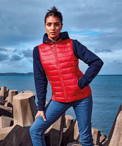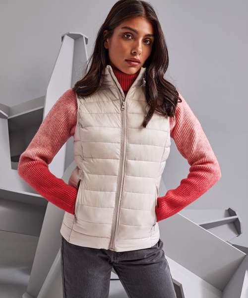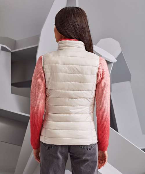 Tonal reverse coil zip on centre front with signature zip puller and internal storm flap with chin guard. Horizontal stitched sandwiched narrow baffles. Tonal reverse coil zip pockets with upper zip garages. Stretch binding around armholes for added protection. Side seam shaped panelling. Packable bag. Internal signature back neck hanger loop. 250gsm lightweight polyester fill. Inside binding around seams. Product contains no branded neck label.* Removable Kimble or looped garment tags. Inner seam label holds important product information on one label with a second label containing brand information which can be cut-away.