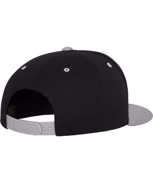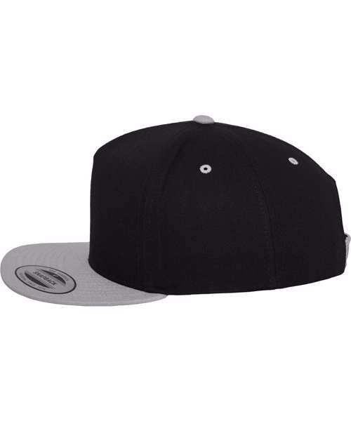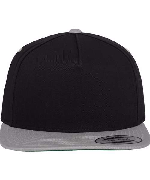 This classic 5-panel snapback has a contrast plastic snap, hard buckram and green undervisor. Contrast eyelets, visor and top button. Ideal for screenprinting.